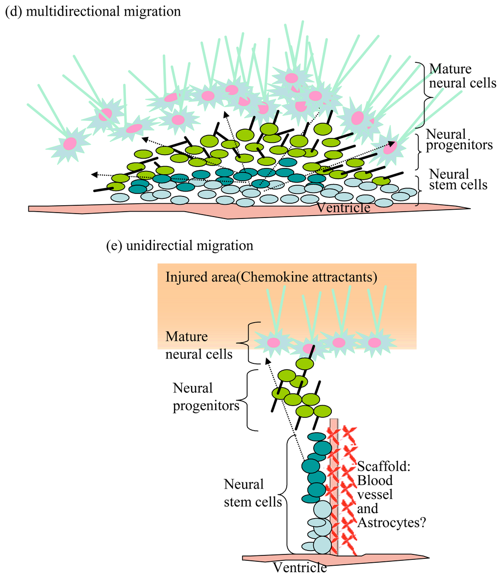 When we conducted monkey ES cell derived neural cell transplantation into hemiplegic mice with brain injury (Figure 1), a significant recovery of motor functions was observed []. We found unidirectional migration of the neural cells from the grafted periventricular region toward the damaged motor cortex where SDF1 was expressed extensively. This migration resembled so-called chain migration, physiologically shown in embryonic brain development and adult forebrain (Figure 3b,e).