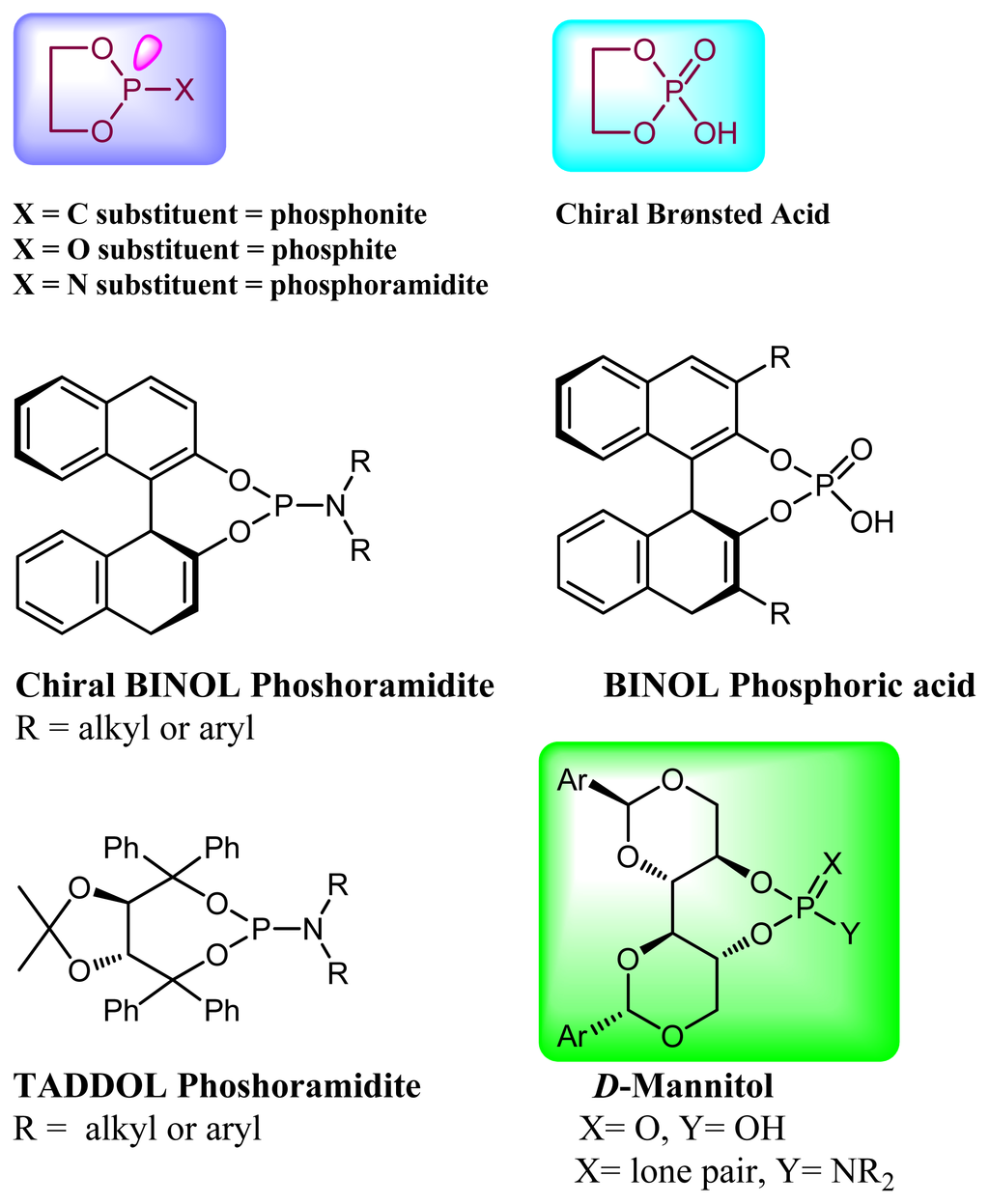 Chiral phosphoramidite ligands and Brønsted acid derived from BINOL or TADDOL backbone.