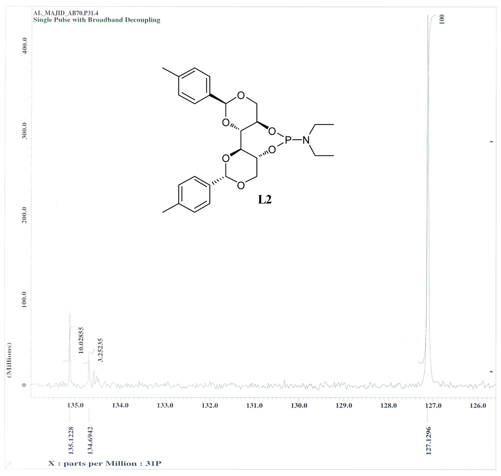 Ligand L1 was obtained by a similar procedure with diethyl amine, using the DCM as the reaction solvent. Similarly, there are four isomers in the mixture, with one isomer dominating the others. The 31P NMR analysis identified the major isomer at δ = 127.2, while the minor isomers showed chemical shift of δ 134.6, 135.12 respectively.