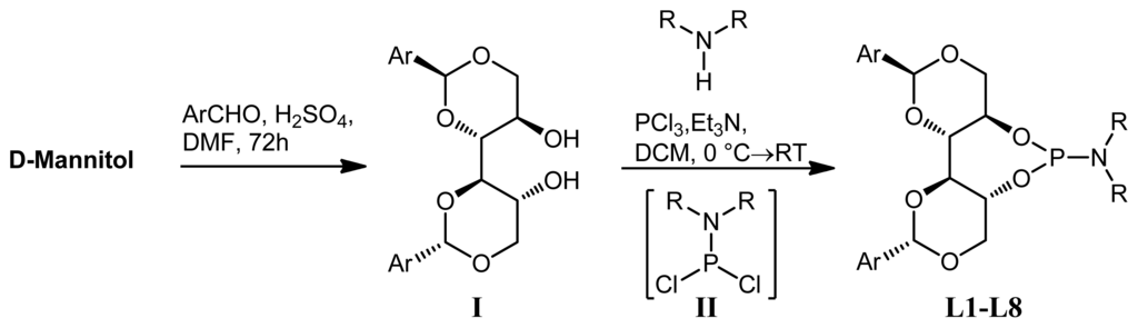 The synthetic procedure started with the reaction of amine derivatives with purified PCl3 and Et3N as base in DCM at 0 °C. The resulting intermediate II was treated with one equivalent of DIOLs I. The ligands were obtained as white or pale yellow solids or oily products in moderate to good yields (Scheme 1).