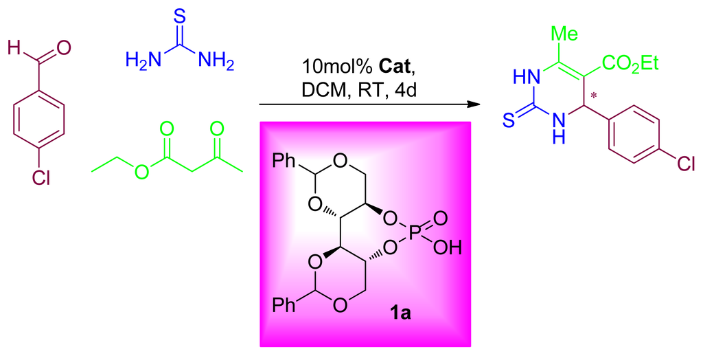 Chiral dihydropyrimidinethiones (DHPMs) have found increasing applications in the synthesis of pharmaceutically-relevant substances exhibiting a wide range of important pharmacological properties. The Biginelli reaction, one of the most useful multicomponent reactions, offers an efficient way to access multi functionalized 3,4-dihydropyrimidin-2-(1H)-ones (DHPMs). Initial screening experiments were performed by applying a Biginelli reaction initiated with the condensation of an aldehyde with urea or thiourea in the presence of a Brønsted acid (Scheme 4). Utilizing 1 equiv. of 4-chlorobenzaldehyde, 1.2 equiv. of thiourea, 3.0 equiv. of ethyl 3-oxobutanoate, and 10 mol% of 1a in DCM and stirred at RT for 4 days. Formation of dihydropyrimidinethiones (DHPMs) was not observed. Although the reaction was carried out at elevated temperature at 70 °C for 6 days, no catalytic activity was observed. From these initial attempts, it is clear that there is no sign of catalytic activity of 1a towards Biginelli reaction.