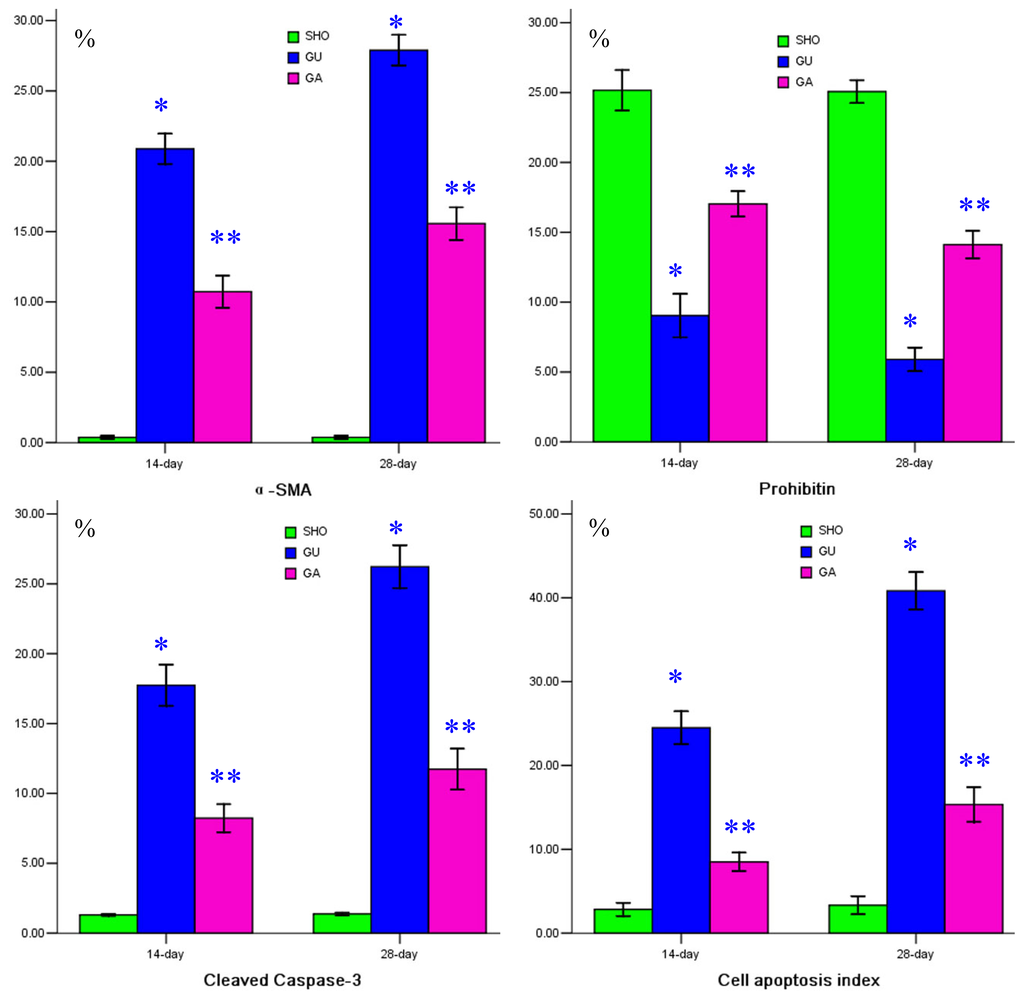 4.3. Immunohistochemical Analysis of the Protein Expressions of Prohibitin, Transforming Growth Factor-β1 (TGF-β1), Collagen-IV (Col-IV), Fibronectin, α-Smooth Muscle Actin (α-SMA) and Cleaved Caspase-3