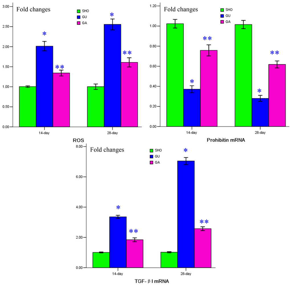 4.6. Real Time Reverse Transcription Polymerase Chain Reaction to Detect Prohibitin/TGF-β1 mRNA Expression in Renal Tissue