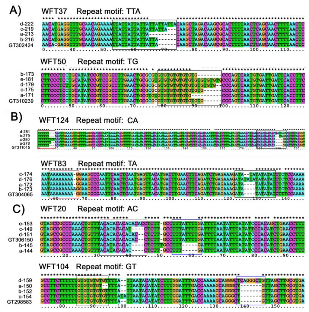 Ninety-five different alleles, whose allele frequency was approximately 98%, were successfully sequenced. All the sequences obtained corresponded exactly to the expected EST sequences. The other 4 rare alleles with a low frequency were not sequenced. Sequence analysis of these alleles revealed that three types of mutational events are responsible for the generation of new alleles (Six loci exhibiting all three mutation patterns are listed in Figure 1, the other 12 are shown in Figures S1 and S2). First, size variation of sequenced alleles was explained by the differences in the numbers of repeat motifs for 7 microsatellites (Figure 1A, Figure S1). Second, at the WFT51, WFT83, WFT108 and WFT124 loci, two different repeat motifs, including one in the flanking region, were found, both contributing to the allele-size variation (Figure 1B, Figure S2A). Third, indels in the flanking region were observed in 7 loci (WFT20, WFT66, WFT87, WFT104, WFT139, WFT141 and WFT144; (Figure 1C, Figure S2B)), but the frequencies of these alleles were very low in four loci (WFT20: 0.088; WFT66: 0.088; WFT87: 0.144 and WFT139: 0.021). Besides the three mutation patterns mentioned above, base substitutions in the repeat or the flanking region were also observed in 9 and 9 loci respectively. They did not contribute to the length changes of the microsatellites. In addition, several loci had multiple mutation types mentioned above, e.g., WFT37 contained both base substitutions in the flanking region and step-wise mutation in the repeat region; WFT104 had both indels in the flanking regions and step-wise mutation in the repeat motif. A minimum number of contiguous repeats might be necessary for slippage to occur. These have been suggested to be four in di-nucleotide repeats and two in tri- and tetra-nucleotide repeats [21,22]. Using these criteria, we calculated the frequency of slippage consistent and inconsistent mutations. The allele size variation mainly came from the slippage at the repeat motifs. Sixty-six alleles with a frequency of 75.5% from the 18 loci possessed this mutation mechanism. Twenty-two alleles from 7 loci showed slippage in the flanking region, with the frequency of 19.9%. In addition, mutation mechanisms other than slippage also occurred in our microsatellites, with the frequencies of 12.6% (20 alleles from 6 loci) in the repeat motifs and 8.4% (11 alleles from 7 loci) in the flanking region. Generally speaking, slippage in the repeat motif and flanking region was the main mutation mechanism for the newly developed microsatellites.