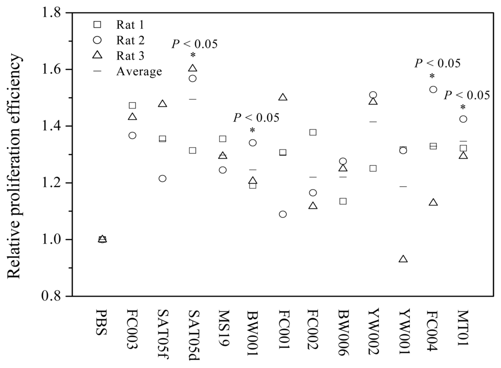 To detect the effects of ODNs on the proliferation of BMSCs, we selected and synthesized 12 ODNs with different sequences using DNA synthesizer as described in the Experimental Section and tested them for their ability to stimulate the proliferation of rat BMSCs in vitro. These ODNs were designed based on the sequences in human microsatellite DNA and mitochondrion DNA and confirmed with immuno-stimulatory or immuno-inhibitory activities [29,31–34]. In the test, Wistar rat BMSCs at the third passage were cultured with a medium containing various ODNs at a final concentration of 1 μg/mL for 72 h. The proliferation of BMSCs was determined using MTT assay. As shown in Figure 1, four ODNs, designated as MT01, SAT05d, BW001 and FC004 were found to have the ability to stimulate the proliferation of all the rat BMSCs. The efficacy was significantly stronger than that induced by PBS (P < 0.05, n = 4).