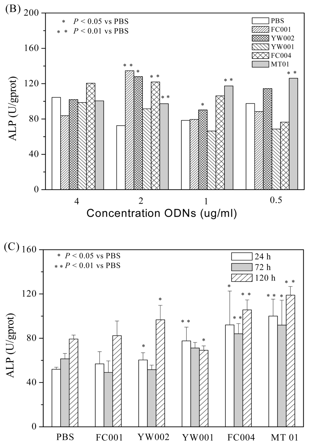 Accumulating studies showed that BMSCs could be induced to differentiate into osteogenic cells. To observe whether the ODNs could also impact the osteoblast differentiation from BMSC, rat BMSCs, cultured to passage 3, were seeded to 12 well plate (2 × 104 cells per well) in 1000 μL complete DMEM with osteogenic media and then cultured for 24 h. After adding the 12 ODNs (1 μg/mL, final concentration) separately, the cells were cultured for another 72 h and then tested for their expression of alkaline phosphatase (ALP), a marker for the early stage differentiation of osteoblasts. As shown in Figure 2A, MT01, FC001, YW002, YW001 and FC004 could strongly stimulate the differentiation of rat BMSCs to osteoblasts. Based on this, the five ODNs were selected to test their dose-effect on the differentiation dynamically. As described above, the BMSCs at passage 3 were cultured with MT01, FC001, YW002, YW001 or FC004 at a dose range of 0.5, 1, 2 and 4 μg/mL(final concentration), respectively, and then assayed for their ALP activity. It was found that MT01 at 2 μg/mL, 1 μg/mL and 0.5 μg/mL, but not at 4 μg/mL, could induce significant expression of ALP (Figure 2B). Next, the five ODNs were tested for their promotion on the differentiation kinetically. The BMSCs at passage 3 were cultured with each of the ODNs at 1 μg/mL (final concentration) for 24, 72 or 120 h, respectively, and then assayed. The results showed that MT01 and FC004 could significantly induce ALP expression at three time-points (Figure 2C). Overall, the dose and kinetic analysis showed that MT01 was the best candidate ODN to induce the differentiation from BMSCs to osteoblasts.