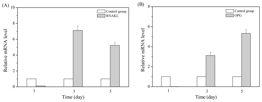 Total RNA was isolated from BMSCs using the Trizol reagent (Sigma, St. Louis, MO, USA) according to the manufacturer’s instructions. The purity of total RNA was determined by the ratio at 260 nm and 280 nm absorbance. Using RT-PCR Array First Strand Kit (SA Bioscience Co., Carlsbad, CA, USA), 1 μg of total RNA was reverse-transcribed into total cDNAs. The cDNAs were subjected to PCR amplification by using specific primers as follows: RANKL (F: 5′-CTG ATG AAA GGA GGG AGC AC-3′; R: 5′-GAA GGG TTG GAC ACC TGA ATG C-3′), OPG (F: 5′-TCC TGG CAC CTA CCT AAA ACA GCA-3′; R: 5′-ACA CTG GGC TGC AAT ACA CA-3′), Osterix (F: 5′-CCT CTC GAC CCG ACT GCA GAT C-3′; R: 5′-AGC TGC AAG CTC TCT GTA ACC ATG AC-3′), Runx2 (F: 5′-TGC TTC ATT CGC CTC ACA AA-3′; R: 5′-TTG CAG TCT TCC TGG AGA AAG TT-3′ ) and collagen I (F: 5′-GAG ATG ATG GGG AAG CTG-3′; R: 5′-ACC ATC CAA ACC ACT GAA G-3′). In each sample, the specific primers of β-actin (F: 5′-TCA GGT CAT CAC TAT CGC CAA T-3′; R: 5′-AAA GAA AGG GTG TAA AAC GCA-3′) were used as an internal reference and simultaneously amplified. Efficiencies (E) of amplicons in the PCRs were determined by dilution curves, and used to calculate the relative quantification values for each target cDNA. The PCRs were performed using an ABI PRISM 7000 detection system under the conditions as follows: 50 °C for 2 min, 95 °C for 10 min, 45 cycles of 95 °C for 15 s, and 60 °C for 1 min. The cycle threshold (Ct) was established in the linear part of the reaction curve at which the amount of amplified target cDNA was calculated. The relative expression levels of a target gene were normalized with the value of β-actin gene, and the 2−ΔΔCt method [42] was used for calculating the relative expression levels. The values were the average of triplicate measurements.