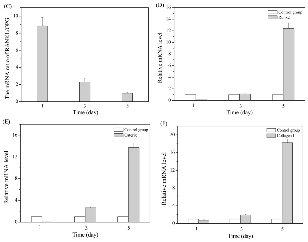 In the detection, BMSCs at the third passage were cultured with MT01 at 1 μg/mL (final concentration) for 1, 3 or 5 days, respectively, and their mRNAs were isolated for real-time PCR analysis. The results showed that stimulation with MT01 for 3 or 5 days induced BMSCs to express significantly increased mRNA level of RANKL and OPG (P < 0.01) (Figure 3A,B). Noticeably, the mRNA ratio of RANKL/OPG gradually decreased from 1 to 5 days (Figure 3C). Meanwhile, mRNA levels of Runx2, Osterix and collagen I were increasingly induced by MT01 for 3 and 5 days (P < 0.01 or P < 0.05) (Figure 3D–F). In conclusion, ODN MT01 could significantly promote the differentiation of rat BMSCs to osteoblastic cells and enhance the osteoblast activity, possibly by inducing the up-regulation of Runx2, Osterix, OPG, RANKL and collagen I in the BMSCs.