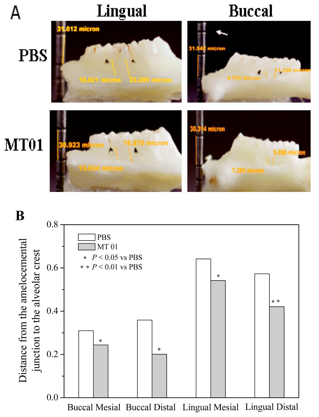 Influence of MT01 on alveolar bone loss in rat with periodontitis. Macroscopic aspects (Lingual and Buccal view) of the mandibles were observed. The yellow lines represented the distance from the amelocemental junction to the alveolar crest. (A) Analysis of the alveolar bone loss by SPOT RT software v3.5 [38,39]; (B) The extent of alveolar bone loss showed in the change of measurement between the control and MT01 treatment groups where n = 3 per group. * Indicates statistically significant difference (P < 0.05) between MT01 and PBS. ** Indicates statistically significant difference (P < 0.01) between MT01 and PBS.