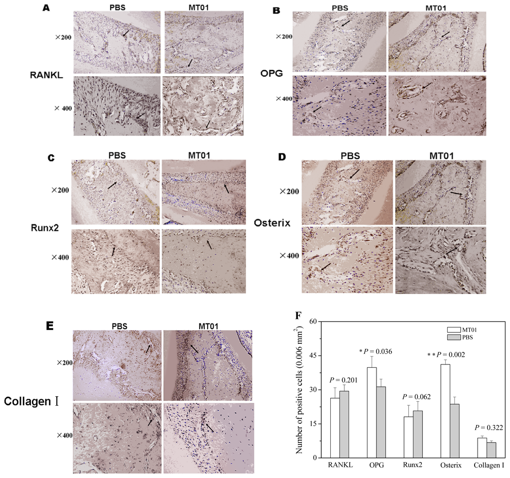 Effect of MT01 on the production of proteins of bone-associated factors. In the sections of the alveolar bone, RANKL (A), OPG (B), Runx2 (C), Osterix (D) and collagen I (E) producing cells were recognized by their specific antibodies, respectively. The positive cells were analyzed statistically and shown in F. Data were expressed by mean ± SD of 6 rats each group (* P < 0.05; ** P < 0.01, compared with the PBS group).