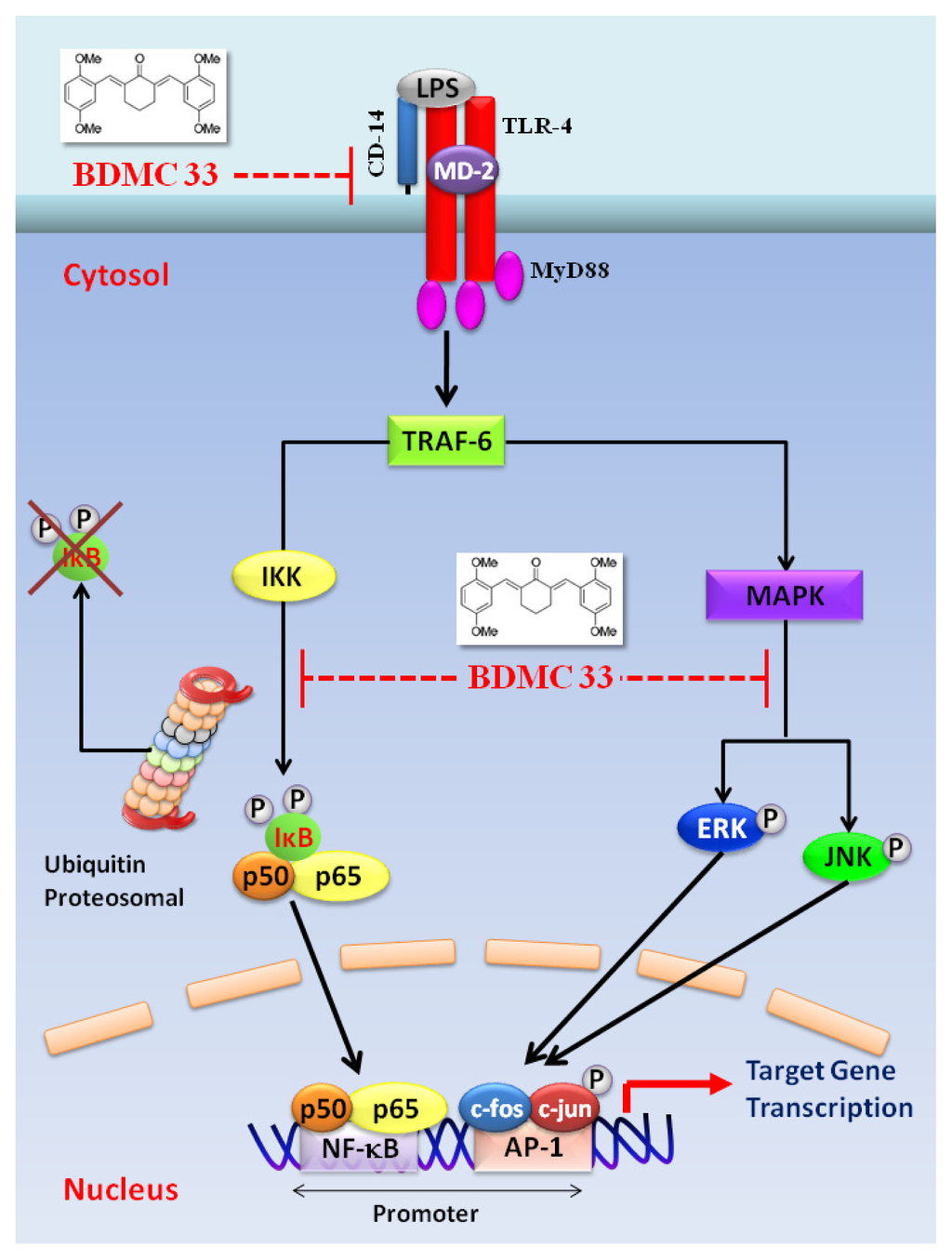 A schematic diagram shows the mechanisms underlying the inhibitory action of BDMC33. TLR-4 stimulation by LPS activates an intracellular signaling cascade that involves the recruitment of MyD88 (myeloid differentiation primary response gene-88) and results in the phosphorylation of TRAF-6 (tumor-necrosis-factor-receptor-associated factor 6), subsequently activate NF-κB and MAPK pathways. The red blunt lines indicate the inhibition by BDMC33.