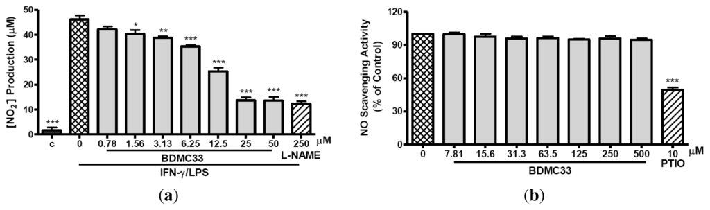 It is well known that excessive production of NO is harmful. Pharmacological interference in the NO production cascade served as a promising chemotherapeutic strategy in anti-inflammatory agent development. In the present study, we have demonstrated a novel synthetic compound, BDMC33, which inhibited IFN-γ/LPS-induced NO production in RAW 264.7 macrophages in vitro. The NO inhibitory action of BDMC33 was neither mediated by its radical scavenging properties nor did it inhibit iNOS enzyme activity, but rather through the down-regulation of iNOS expression. The dose-dependent inhibition behavior of BDMC33 on NO production via iNOS expression showed that the blockage was at the transcriptional regulation level or up-stream signaling molecule. Several studies have also reported that curcumin and its derivatives suppressed iNOS expression in macrophages via interference of the up-stream signaling pathways, especially on NF-κB and MAPK activation [26–28].