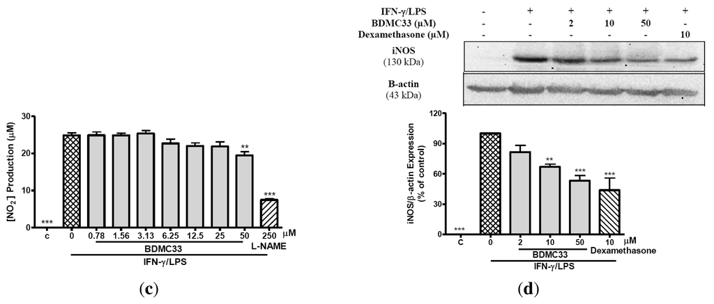 RAW 264.7 cells (4 × 105 cells/well) were seeded into a tissue culture grade 96-well and triggered with IFN-γ/LPS for 12 h. Then, the cells were washed three times with phosphate buffer saline (PBS) and treated with increasing concentrations of BDMC33 for a further 12 h. The nitrite concentration of supernatant was determined by Griess assay as described in Section 2.5.