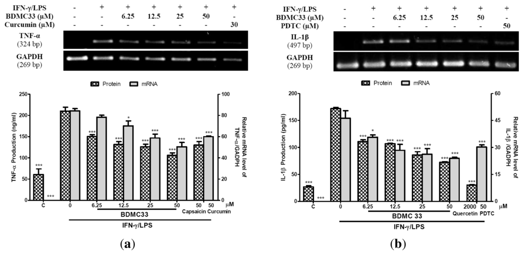 (a) Effect of BDMC33 on TNF-α production and gene expression in IFN-γ/LPS-induced RAW 264.7. The IC50 was calculated at 9.40 ± 1.67 μM. Capsaisin (50 μM) and curcumin (30 μM) were used as positive drug control for protein and mRNA expression level of TNF-α respectively; (b) Effect of BDMC33 on IL-1β production and gene expression in IFN-γ/LPS-induced RAW 264.7. The IC50 was calculated at 29.66 ± 0.72 μM. Quercetin (2000 μM) and pyrroline dithiocarbamate (PDTC) (30 μM) were used as positive drug control for protein and mRNA expression level of IL-1β respectively.C; Basal protein and mRNA expression level of TNF-α/IL-1β without IFN-γ/LPS treatment. All values are expressed in mean ± S.E.M. of three independent experiments. * P < 0.05; *** P < 0.001, significantly different from IFN-γ/LPS-treated control group.