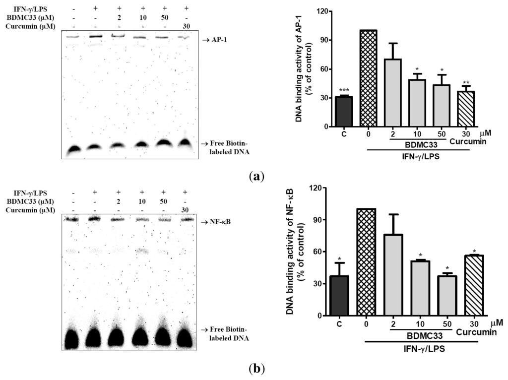 To further elucidate the underlying molecular mechanism mediated by BDMC33, the DNA binding activity of two important transcriptional factors (NF-κB and AP-1) involved in pro-inflammatory gene expression regulation were examined. Stimulation of LPS/IFN-γ resulted in a significant increase in DNA binding activity of both NF-κB and AP-1, as evaluated by electrophoretic mobility shift assay (EMSA). The specificity of binding was examined by competition with the unlabeled oligonucleotide (data not shown). We have demonstrated that the DNA binding activity of both NF-κB and AP-1 were significantly reduced in a nuclear extract obtained from IFN-γ/LPS-induced RAW 264.7 concomitant treated with different concentrations of BDMC33 (Figure 4). Curcumin was used as a positive control and showed significant inhibition in DNA binding activity of AP-1 (63.54 ± 6.12%) and NF-κB (43.82 ± 0.74%).