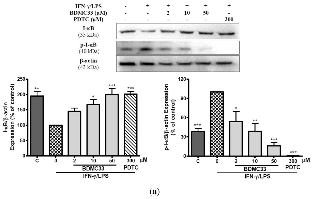 Effects of BDMC33 on I-κB degradation and I-κB phosphorylation as well as NF-κB nuclear translocation in IFN-γ/LPS induced RAW 264.7 macrophages. (a) Cell lysate analyzed by western blotting using anti-phospho-I-κB and anti-I-κB antibodies. Expression of β-actin expression was used as loading control and normalized against IFN-γ/LPS treated group; (b) Cells cultured in chamber slide were stimulated with IFN-γ/LPS and treated with increasing concentrations of BDMC33. The cellular localization of p65 NF-κB (fluorescein isothiocynate (FTIC) stained, green fluorescent) and nucleus region (DRAQ5 stained, red fluorescent) of cells were identified by immunofluorescence microscopy.All values are the mean ± S.E.M. of three independent experiments. * P < 0.05, ** P < 0.01, *** P < 0.001 are significantly different from IFN-γ/LPS-treated control group.