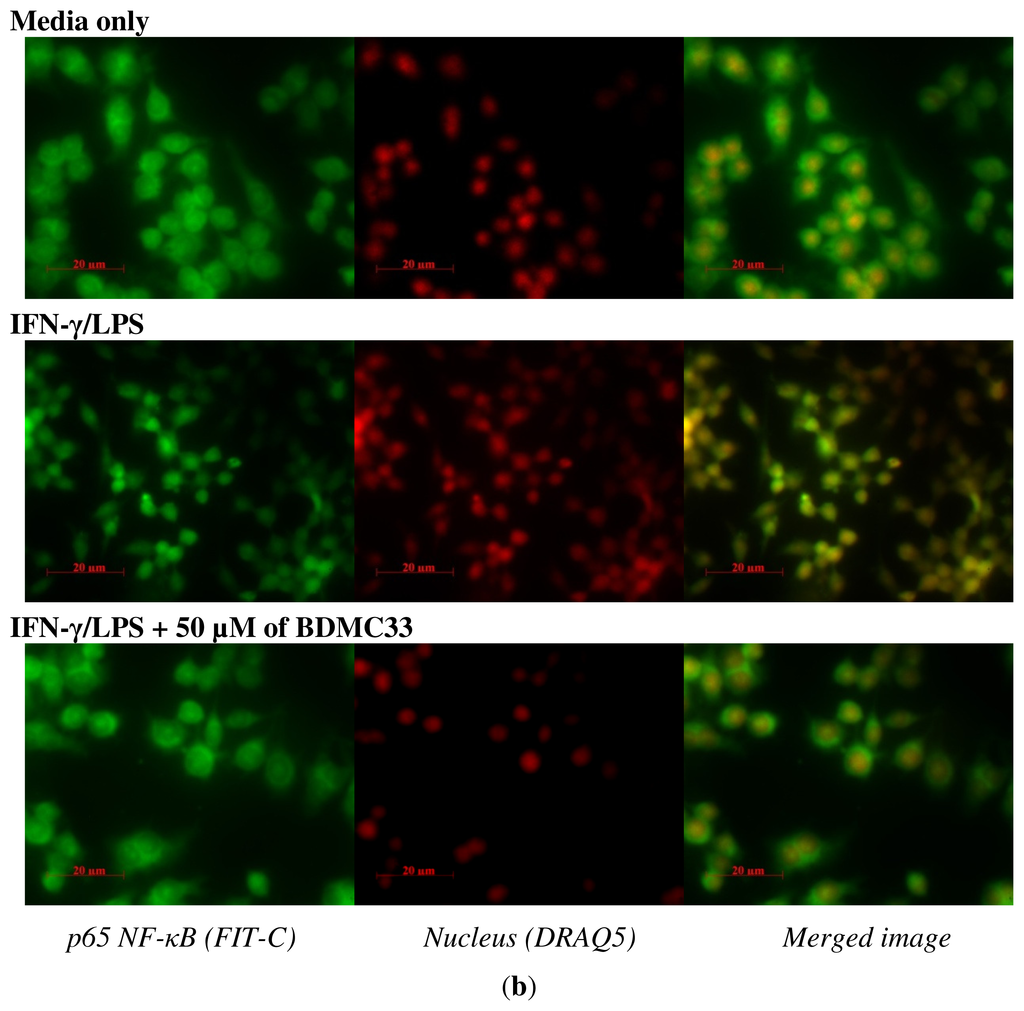 To gain further insight into the mechanism of BDMC33-mediated regulation of NF-κB activation, we examined the inhibitory effects of BDMC33 on degradation and phosphorylation of I-κB as well as nuclear translocation of the NF-κB p65 subunit. In cells stimulated with IFN-γ/LPS, the expression level of the I-κB was down-regulated, concomitant with the increase of phosphorylated I-κB protein. However, the treatment of BDMC33 prominently sustained I-κB expression levels and inhibited the expression of phosphorylated I-κB protein in a concentration-dependent manner. PDTC, a standard NF-κB inhibitor, was used as positive drug control to maintain the I-κB protein level and showed strong inhibition in phosphorylated I-κB expression (Figure 5a). The IFN-γ/LPS-induced degradation of I-κB can cause the release of NF-κB from the cytoplasmic NF-κB/I-κB complex and allow its translocation into the nucleus of cells. Therefore, we further investigate whether BDMC33 prevents the translocation of the p65 NF-κB into the nucleus after release from the I-κB. As shown in Figure 5b, the p65 subunit mainly localized on the cytoplasm region of the non-induced macrophages and stimulation of cells with IFN-γ/LPS resulting in p65 accumulation in cell nuclei. We have demonstrated that the treatment of BDMC33 (50 μM) abrogated the IFN-γ/LPS-induced p65 nuclear translocation.