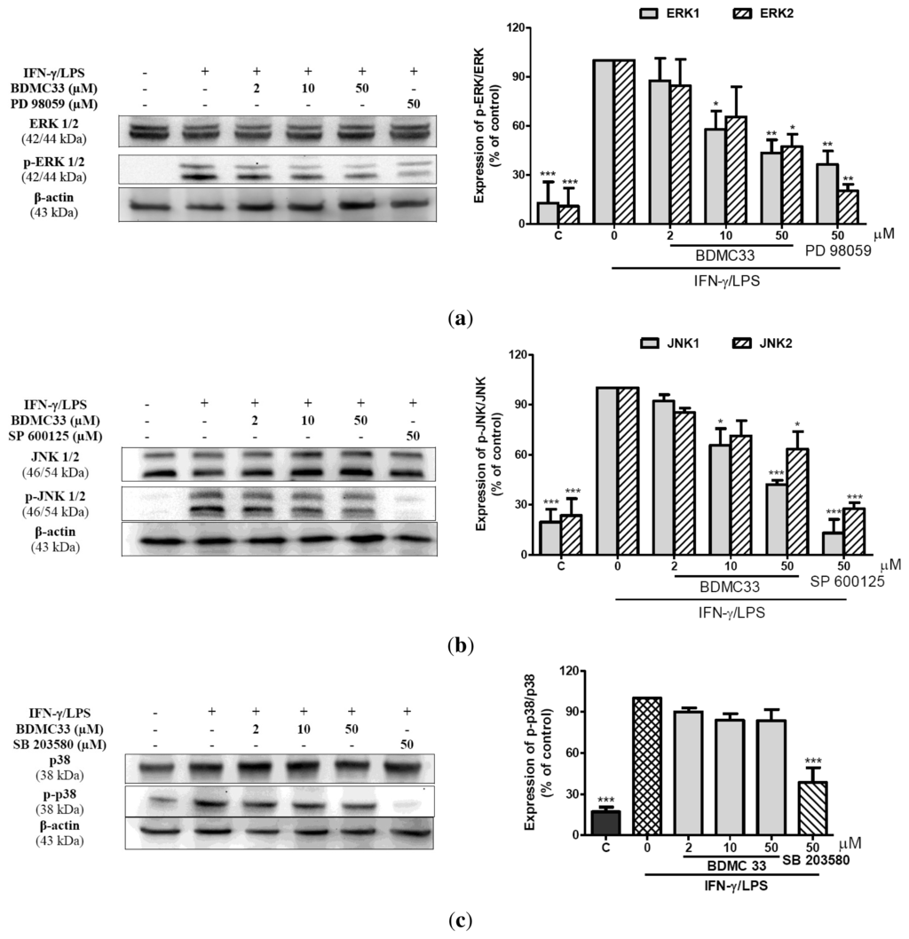 Effects of BDMC33 on MAPKs activation in IFN-γ/LPS-induced RAW 264.7 macrophages. Cells were stimulated with IFN-γ/LPS and treated with increasing concentrations of BDMC33 for 30 min. Whole cell lysates were analyzed with western blotting with specific antibodies. PD98059, SP600125 and SB203580 were used as standard inhibitors for (a) ERK, (b) JNK and (c) p38 activation, respectively. The ratio of immunointensity between the phospho-MAPKs (p-ERK1/2, p-JNK1/2 and p-p38) and total-MAPKs (ERK1/2, JNK1/2 and p38) were calculated from three independent experiments.Expression of β-actin expression was used as loading control and normalized against IFN-γ/LPS treated group. C; Basal level of MAPK expression without IFN-γ/LPS treatment. The results are expressed in mean ± S.E.M. of three independent experiments. * P < 0.05, ** P < 0.01, *** P < 0.001, significantly different from IFN-γ/LPS-treated control group (second column).