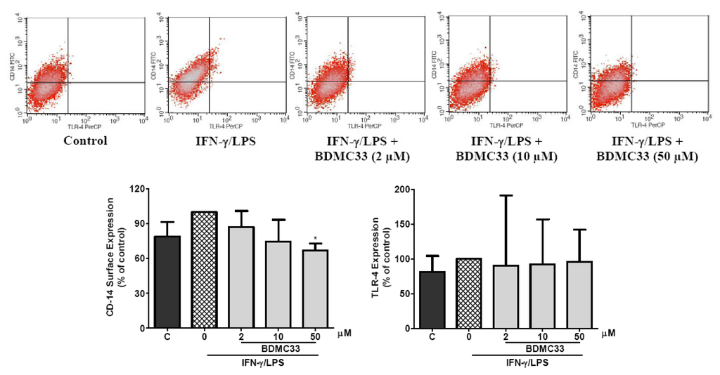The level of accessory molecule expression on the surface of macrophage cells reflects their inflammatory responsiveness. To investigate whether BDMC33 modulates the accessory molecules on activated macrophages, the surface expression of TLR-4 and CD-14 of macrophages was analyzed by flow cytometer. As shown in Figure 7, the CD-14, constitutively expressed in a relatively high level and exposure of IFN-γ/LPS, caused the slight augmentation of CD-14 expression in RAW 264.7 cells, but was not statistically significant. Conversely, the expression of TLR-4 was relatively low and remained unchanged following IFN-γ/LPS treatment. The treatment of BDMC33 significantly inhibited the expression of CD-14 by approximately 32.30 ± 3.45% at the highest concentration tested (50 μM), while the TLR-4 expression was not altered by BDMC33 treatment.