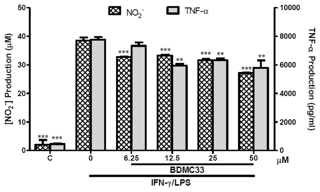 Effects of BDMC33 on NO and TNF-α production in IFN-γ/LPS-induced BV-2 microglia cells. Cells were stimulated with IFN-γ/LPS and treated with increasing concentrations of BDMC33. Concentrations of NO2− and TNF-α in the media was determined by Griess assay and ELISA, respectively.C, Basal level of NO2−/TNF-α without IFN-γ/LPS treatment. All values are the mean ± S.E.M. of three independent experiments. * P < 0.05, ** P < 0.01, *** P < 0.001, significantly different from IFN-γ/LPS-treated control group.
