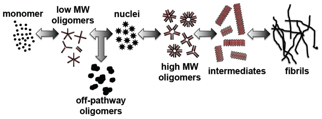 AD is the most common cause of dementia and the most prevalent neurodegenerative disorder [,]. The neurodegenerative effects of AD are hypothesized to arise from Aβ, a partially folded protein that aggregates during the disease process. Aβ was first identified by Masters et al. as the aggregated protein [] deposited within plaque cores found in AD brain. In its monomeric form, this protein may be harmless []. However, Aβ monomer can self-assemble via a nucleation-dependent pathway into Aβ oligomers, larger Aβ aggregation intermediates, and eventually the fibrillar aggregates that deposit in the brain (Figure 1) [,–]. Steps within the Aβ aggregation pathway are reversible, such that deposited fibrils could give rise to soluble oligomers and intermediates. Soluble aggregate species that appear between monomer and insoluble fibrils have been termed within the literature as oligomers [], micelles [], amyloid-derived diffusible ligands (ADDLs) [,], βamy balls [], amylospheroids (ASPDs) [], and protofibrils [,], and the aggregate sizes associated with these definitions overlap in range. Smaller species are most commonly referred to as oligomers, including both low molecular weight and high molecular weight species, while larger intermediates are often referred to as protofibrils. Controversy exists concerning the exact size of the nucleus formed within the rate-limiting step of the aggregation pathway; however, most reports speculate that the nucleus is oligomeric in nature [–]. In addition to oligomers formed along the aggregation pathway, off pathway oligomers and higher order assemblies, which fail to give rise to an organized fibril structure, have also been identified [,].