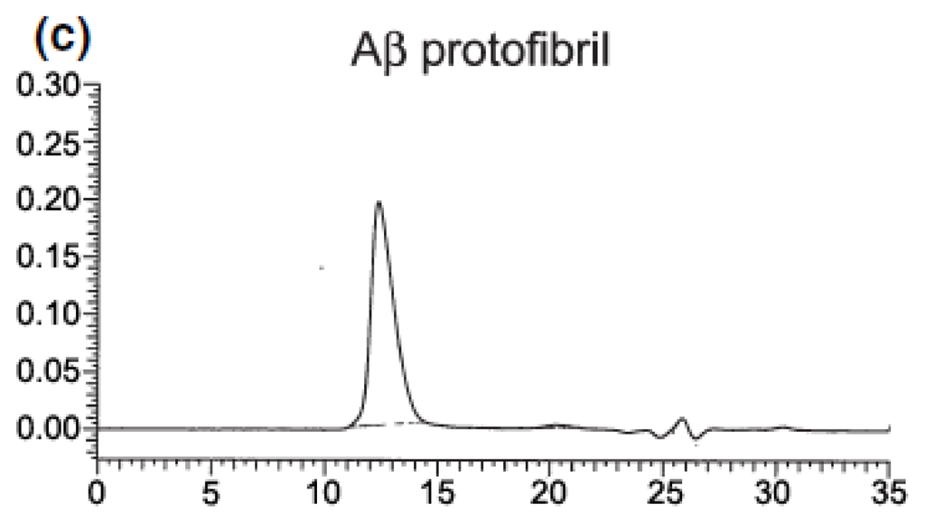 Although SEC is typically utilized in conjunction with another technique, SEC as a standalone technique has been employed for the study of Aβ aggregates [–]. Englund et al. used SEC to detect low molecular weight Aβ aggregates, Aβ protofibrils, and Aβ fibrils formed using different Aβ sample preparations []. The size of low molecular weight Aβ aggregates ranged from 4–20 kDa (Figure 10, panel a), while Aβ protofibrils were >100 kDa (Figure 10, panel c). A more narrow size distribution of Aβ1-42 oligomers of 24 ± 3 kDa (pentamer–hexamer) has been obtained by Ahmed et al. with SEC []. This resolution was achieved by stabilizing Aβ1-42 oligomers at a low temperature (4 °C) and low salt concentration (10 mM NaCl). Zheng et al. have analyzed via SEC freshly prepared 1 mg/mL Aβ1-40 in PBS (pH 7.4), diluted from DMSO, and achieved resolution of an Aβ1-40 trimer with molecular weight of 11.6–15.7 kDa []. The difference in sizes obtained by Ahmed et al. and Zheng et al. most likely result from differences in sample preparation. While these studies show promising results for resolution of a single low molecular weight Aβ oligomer, the resolution of individual intermediate Aβ oligomeric sizes formed during aggregation has not been achieved using SEC as a standalone technique.