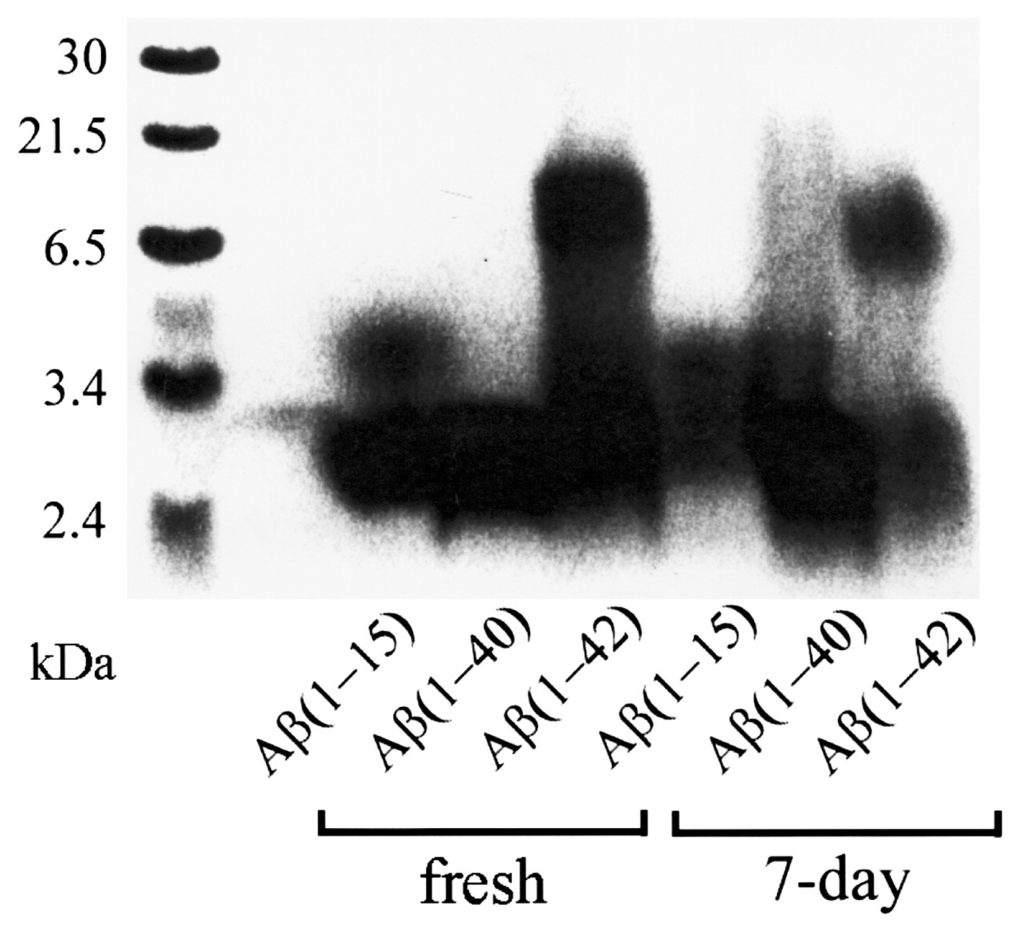 Tricine-SDS-PAGE analysis of the aggregation states of Aβ peptides freshly dissolved or incubated for 7 days. Aβ1-42 exhibits bands at 5–20 kDa in both freshly prepared samples and samples incubated for 7 days. Aβ1-40 incubated for 7 days also exhibits a smear at higher molecular weights, which is absent in freshly prepared samples. Reprinted from [], with permission from Elsevier.