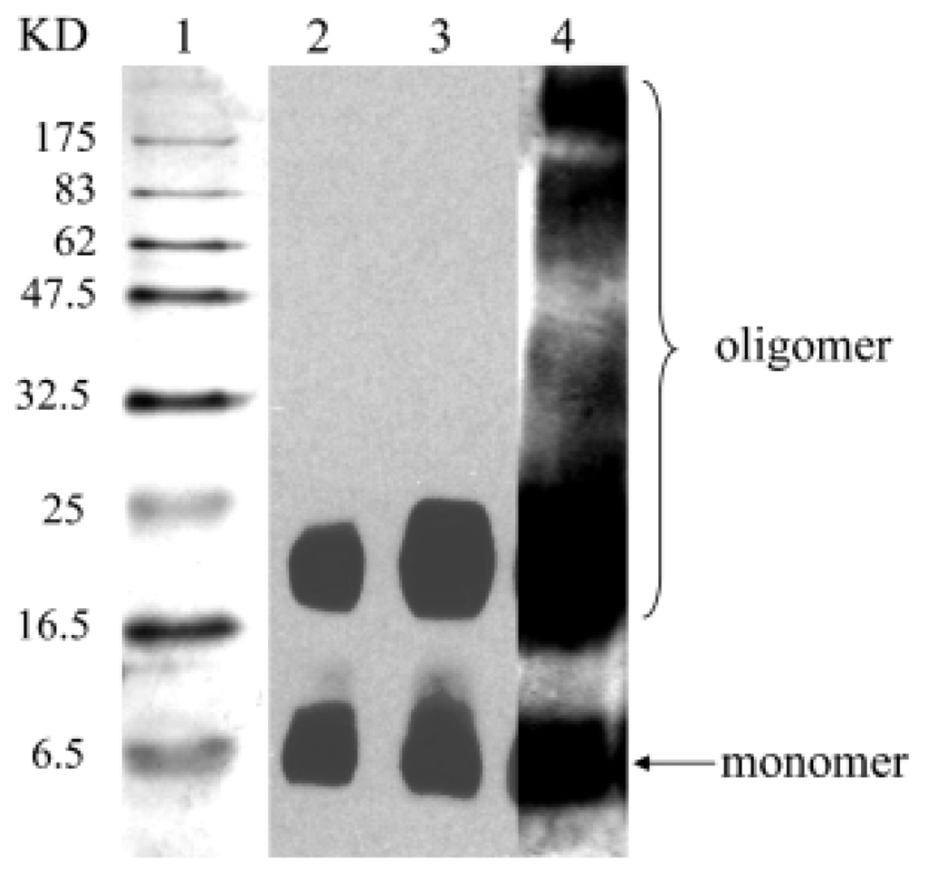 Aβ1-42 oligomers obtained upon incubation at 4 °C for 24 h. A 5 mM Aβ1-42 sample was prepared in DMSO and diluted to 100 μM in Ham’s F12 medium without phenol red. Oligomer mixture was separated by 15% SDS-PAGE, transferred to nitrocellulose membranes, and probed with monoclonal antibody A8 (Lanes 2 and 3) or 6E10 (Lane 4). Sample in Lane 2 was heat denatured prior to analysis, while sample in Lane 3 was untreated. Reprinted from [] with permission. The publisher for this copyrighted material is Mary Ann Liebert, Inc. publishers.