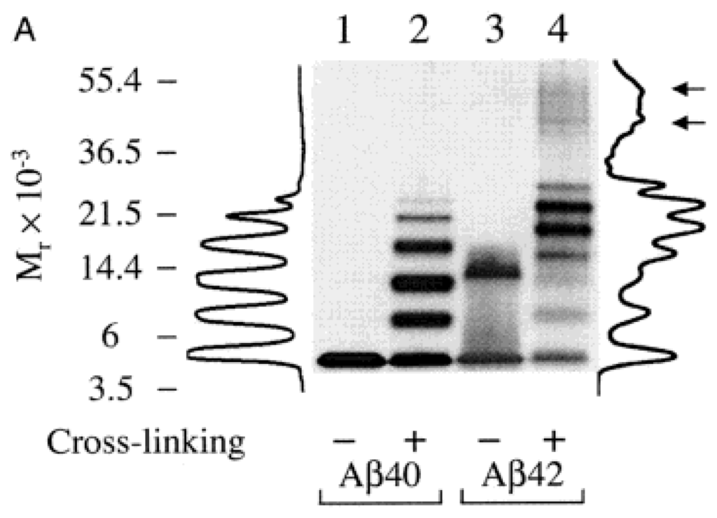 SDS-PAGE analysis of non-cross-linked (lanes 1 and 3) and cross-linked (lanes 2 and 4) Aβ1-40 and Aβ1-42. Densitometric intensity profiles of lanes 2 and 4 are shown on the right and left sides of the gel, respectively. Molecular weight standards are shown on the left in kDa. Adapted from [] with permission. Copyright (2003) National Academy of Sciences, U.S.A.
