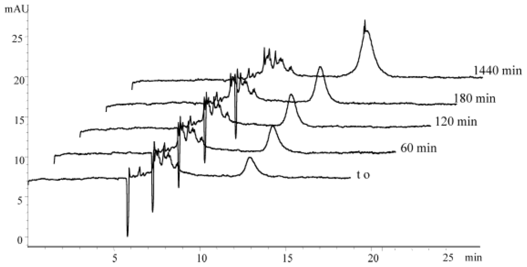 CE with UV detection has been utilized by various researchers to detect Aβ species from monomers to large aggregates. Verpillot et al. used CE-UV to separate monomeric Aβ ranging in size from 37–42 residues and differing in length by a single residue, however they did not examine Aβ aggregation []. A study by Sabella et al. applied CE-UV with an SDS rinse for the detection of Aβ1-40 and Aβ1-42 oligomers formed in PBS (pH 7.4) at room temperature []. At 0 h, peaks for Aβ1-42 oligomers in a size range from monomers to undecamers (~50 kDa)/dodecamers (~54 kDa) and larger aggregates were obtained (Figure 5, t0). A similar peak pattern was obtained over an incubation time period of 24 h with an increase in intensity of the higher molecular mass (>50 kDa) oligomer peak (Figure 5, t = 1440 min). However, resolution of individual species, especially in the larger aggregate peak, was not achieved. Compared to Aβ1-42, the peaks for Aβ1-40 were better resolved, but a drastically different peak pattern was observed. At 0 h, three peaks ranging in size from 3 to 30 kDa were obtained. A decrease in the intensity of the 10 to 30 kDa peak was observed over an incubation period of 24 h with the disappearance of all peaks after 48 h. This result shows that CE-UV is capable of detecting small Aβ1-40 species and intermediate oligomeric Aβ1-42 species. In addition, the CE electrophoretic profiles of Aβ1-40 and Aβ1-42 differ significantly, supporting observations by PAGE that these two proteins differ in their early stages of aggregation.