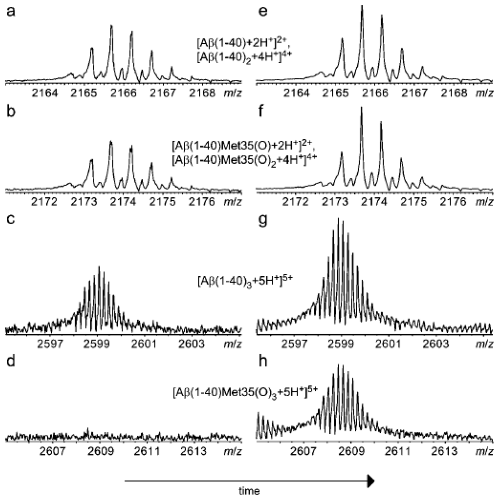 ESI-Mass spectra of 4.0 μM freshly dissolved Aβ1-40 (a and c), freshly dissolved Aβ1-40Met35(O) (b and d), Aβ1-40 and Aβ1-40Met35(O) incubated for 41 min (e and f), and Aβ1-40 and Aβ1-40Met35(O) incubated for >95 min (g and h). Aβ1-40 samples were dissolved in H2O and Aβ1-40Met35(O) samples were dissolved in H2O and 2.7% H2O2. Reprinted with permission from []. Copyright (2002) The American Society for Biochemistry and Molecular Biology.