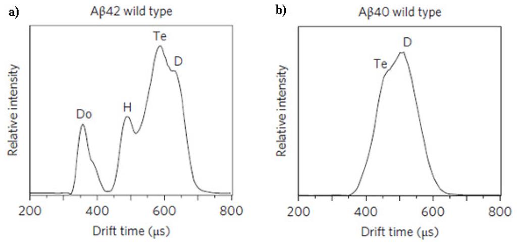 Various research groups have utilized IM-MS to gain a better understanding of the early events of Aβ aggregation. Aβ1-40 conformational states in freshly dissolved and aggregated solutions have been studied by Iurascu et al. []. Two different conformational states were obtained for freshly dissolved Aβ1-40 and the soluble fraction obtained by Aβ1-40 incubation for 5 days at 37 °C and pH 7.5. Bernstein et al. used IM-MS to study the aggregation of Aβ1-42 versus Aβ1-42 with a Phe19→Pro19 substitution []. Monomers and large oligomers were produced by unfiltered Aβ1-42, while protein passed through a 10,000 amu filter yielded monomer, dimer, tetramer, hexamer, and an aggregate of two hexamers. In contrast, the Pro19 alloform produced monomer, dimer, trimer, and tetramer but no large oligomers. In a more recent study by Bernstein et al., a mechanism for Aβ1-40 and Aβ1-42 oligomerization and eventually fibril formation was postulated []. Using IM-MS, this group was able to determine the shape and size of Aβ1-40 and Aβ1-42 oligomers. Aβ1-40 oligomerization proceeded via the formation of dimer and tetramer followed by the very slow formation of fibrils containing a β-sheet structure. In contrast, Aβ1-42 proceeded via the formation of dimer, tetramer, and a hexameric paranucleus followed either by the formation of dodecameric species or the slow conversion into fibrils containing a β-sheet structure. Representative IM-MS data obtained by Berstein et al. for Aβ1-42 and Aβ1-40 are shown in Figure 7. Similar findings about the early oligomerization behavior of Aβ1-40 and Aβ1-42 were obtained by Murray et al. using IM-MS []. In addition, these researchers found that in an equimolar mixture of Aβ1-40 and Aβ1-42, Aβ1-40 inhibited the formation of higher molecular weight oligomers by Aβ1-42. This result suggests that Aβ1-40 could sequester Aβ1-42 into stable tetramers and prevent the further oligomerization of Aβ1-42 into dodecameric species.