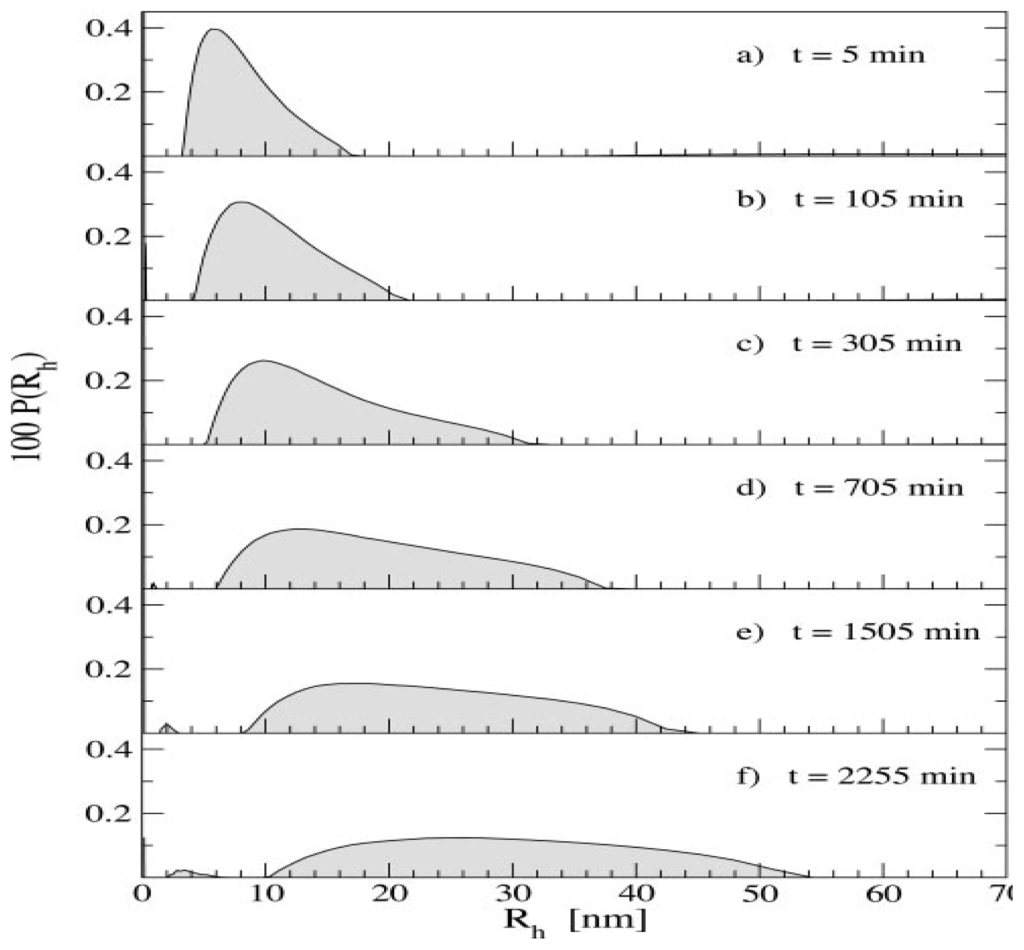 Time evolution of RH for a 185 μM Aβ1-40 sample incubated at pH 3.1 and 37 °C. Distributions were determined using a constrained regularization method. Reprinted with permission from []. Copyright (2005) The American Society for Biochemistry and Molecular Biology.