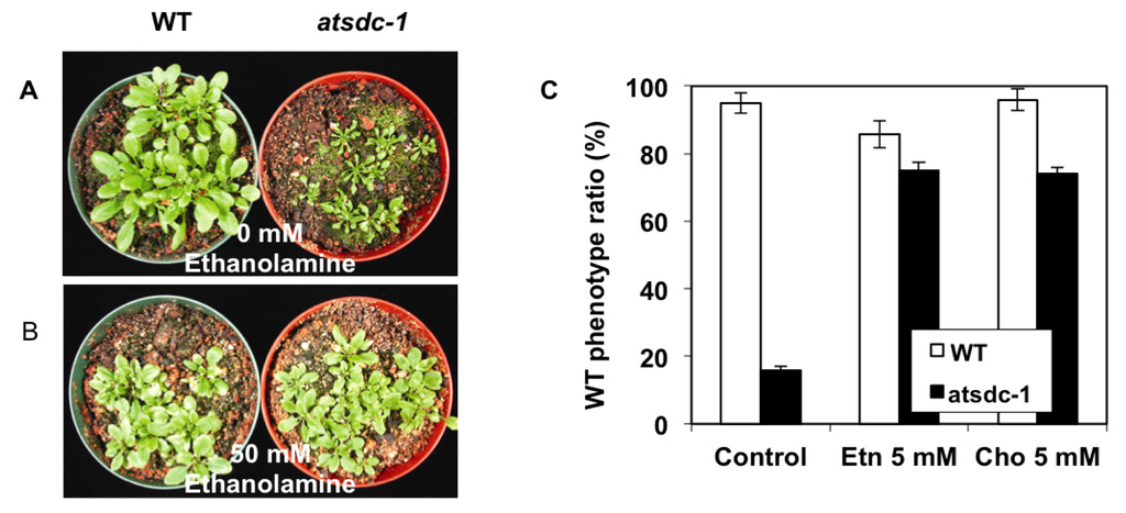 Because AtSDC is involved in the conversion of serine to ethanolamine and the eventual biosynthesis of choline [], the atsdc-1 mutant seedlings should be deficient in these metabolites. We therefore applied ethanolamine or choline to atsdc-1 mutant plants growing in soil or MS agar plates. Although the application of 50 mM ethanolamine on soil grown plants had only a slight effect on the growth of the wild type, it remarkably rescued the atsdc-1 developmental defects (Figure 5A,B).