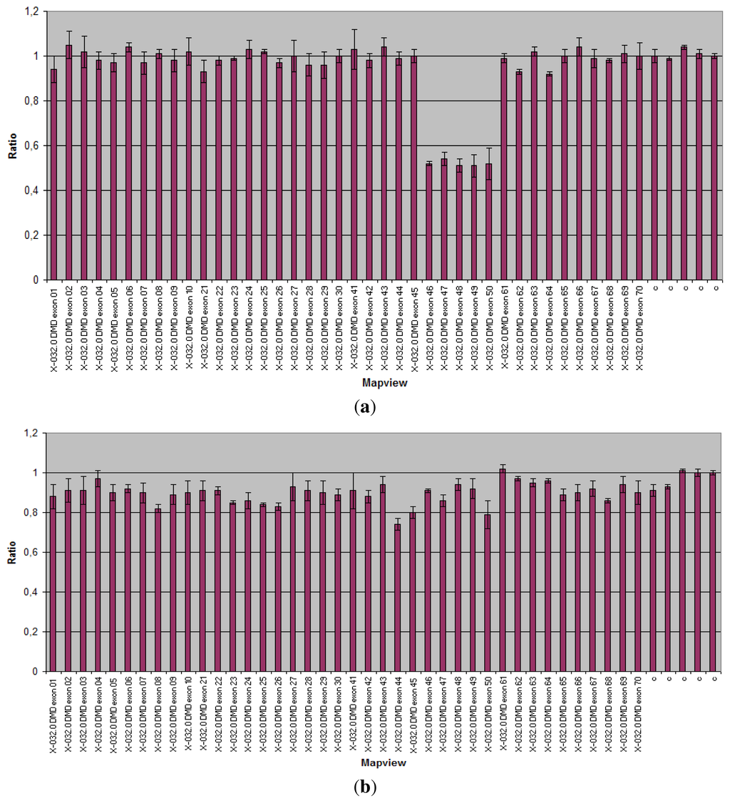 Multiplex Ligation-dependent Probe Amplification (MLPA) analysis of the Duchenne Muscular Dystrophy (DMD) gene. Abscissa represents DMD gene and control probes (c); ordinate represents fluorescent intensity of amplification. For each probe, the ratio <0.75 stands for deletion; and the ratio >1.3 stands for duplication. (a) MLPA analysis showing a heterozygous deletion of exons 46–50 (ratio < 0.75) of the DMD gene in the mother of an affected patient; (b) Normal control (075 < ratio < 1.3).