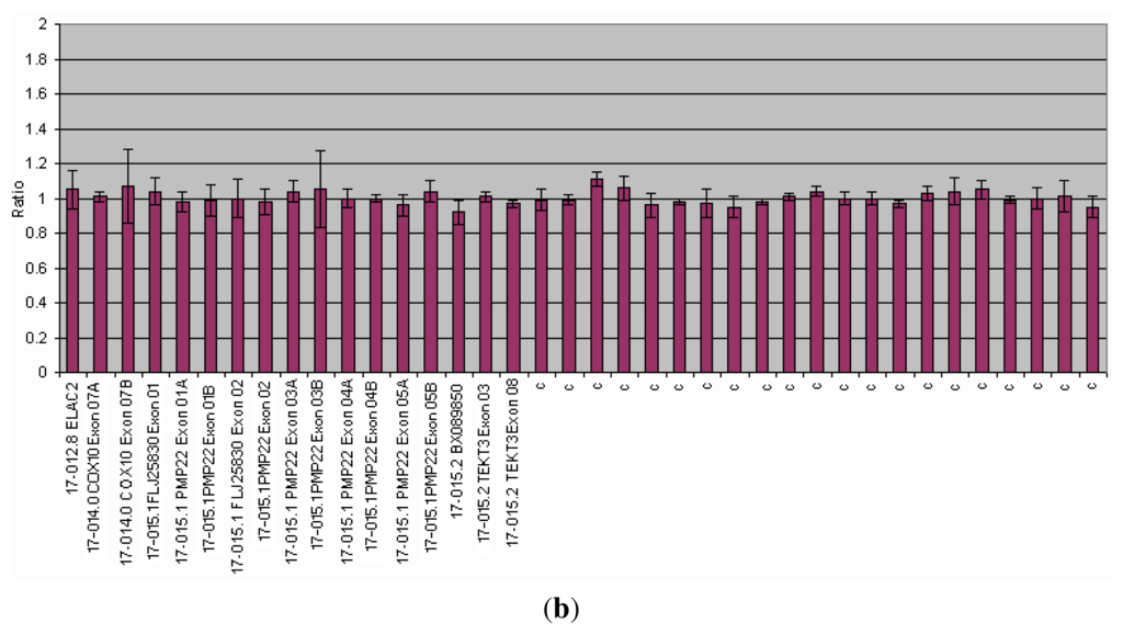 MLPA analysis of the PMP22 gene. Abscissa represents PMP22 gene and control probes (c); ordinate represents fluorescent intensity of amplification. For each probe, the ratio <0.75 stands for deletion; and the ratio >1.3 stands for duplication. (a) duplication of the PMP22 gene (ratio > 1.3) in a patients affected by Charcot Marie Thoot (CMT) disease; (b) Normal control (075 < ratio < 1.3).