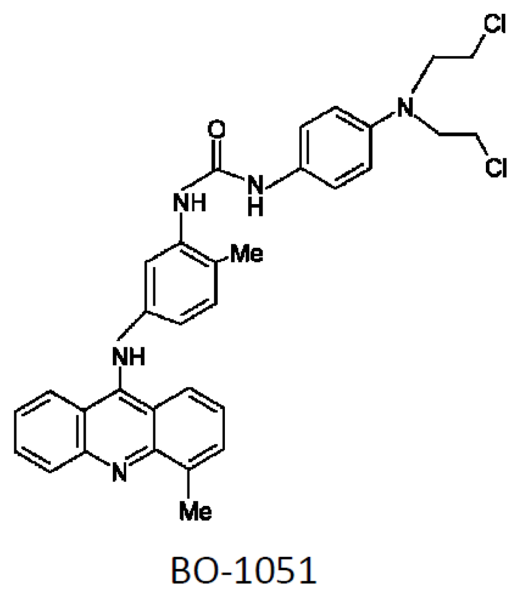 - Chu, P.M.; Chiou, S.H.; Su, T.L.; Lee, Y.J.; Chen, L.H.; Chen, Y.W.; Yen, S.H.; Chen, M.T.; Chen, M.H.; Shih, Y.H.; et al. Enhancement of radiosensitivity in human glioblastoma cells by the DNA N-mustard alkylating agent BO-1051 through augmented and sustained DNA damage response. Radiat. Oncol 2011, 6. [Google Scholar] [CrossRef]