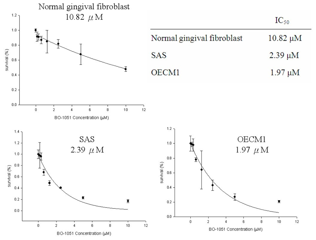 The dose response curve of BO-1051-induced cytotoxicity and determination of the IC50 value in normal gingival fibroblasts, SAS cells, and OECM1 cells. BO-1051 was sequentially diluted by the addition of DMSO and then added to the cells and cultured for 48 h. A MTT assay was used to analyze the viability and to determine the IC50 value in the oral cancer cell lines SAS and OECM1, as well as normal gingival fibroblasts, in response to BO-1051 treatment. The IC50 value of SAS cells, OECM1 cells, and normal gingival fibroblasts were 2.39 μM, 1.97 μM, and 10.82 μM, respectively.
