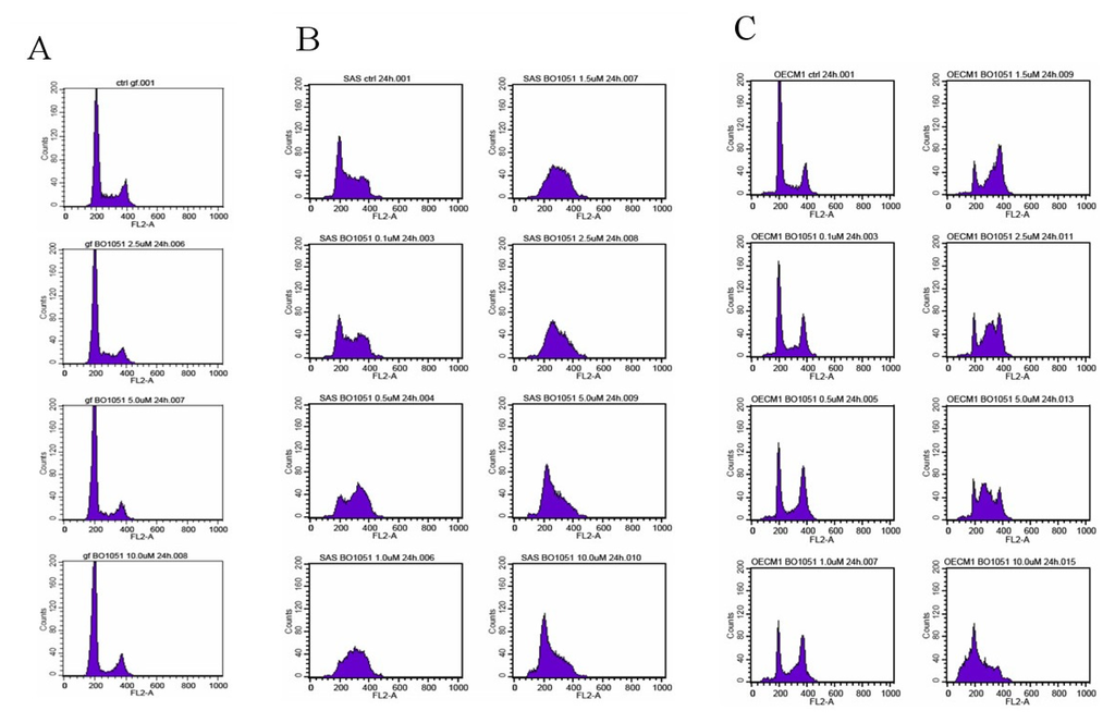 To investigate the BO-1051-mediated cytotoxic effect on oral cancer cells further, we evaluated the effect of BO-1051 on the growth of oral cancer cells by conducting cell cycle analysis. In normal gingival fibroblasts, BO-1051 did not show an observable effect on cell cycle progression (Figure 3A). In both SAS and OECM1 cells (Figure 3B,C), correlating with increasing doses of BO-1051, the cell number in G0/G1 phase gradually reduced, while the cell number in S and G2/M phases increased, indicating a G2/M cell cycle arrest. At doses higher than 2.5 μM, the G2/M cell cycle arrest was further enhanced, and S phase cell cycle arrest was induced. There was no increase of cells in the sub-G1 phase with the different doses of BO-1051 (Figure 3). These data suggested that BO-1051 has an inhibitory role on oral cancer cells partially via the induction of cell cycle arrest.
