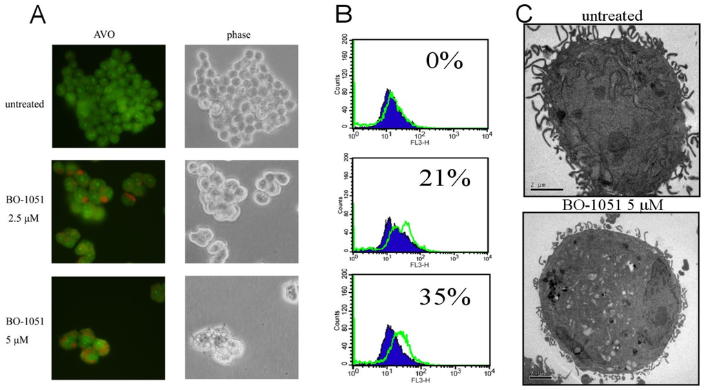 BO-1051 induces formation of acidic vesicular organelles (AVOs). (A) Induction of AVOs by BO-1051 in SAS cells. The cells were treated with various concentrations of BO-1051 and stained with acridine orange. Red fluorescence indicates the induction of AVOs; (B) Quantification of acridine orange staining was performed with flow cytometry; (C) Electron microscopy confirmed the induction of AVOs.