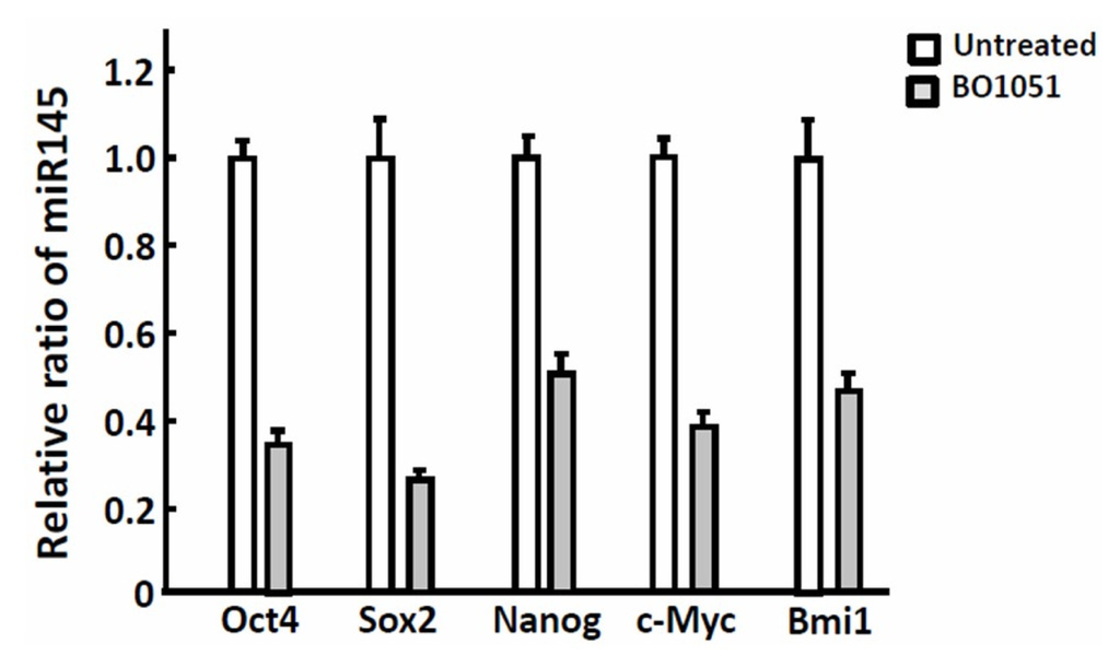 The effect of BO-1051 on the gene expression of stemness markers. Quantitative RT-PCR analysis of Oct4, Sox, Nanog, c-Myc and the oncogene Bmi-1 in the oral cancer cells with or without BO-1051 treatment was performed.