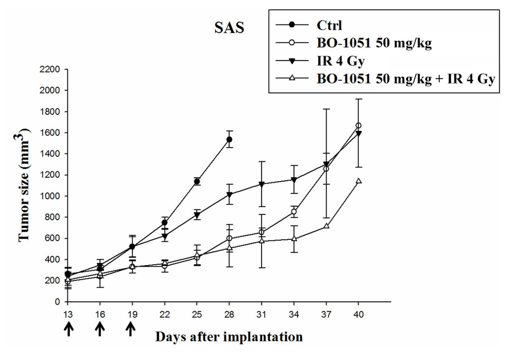 To evaluate the tumor suppressive effects of BO-1051 in vivo, we performed a xenograft tumor assay in nude mice. Xenotransplantation of the oral cancer cell line SAS led to significant tumor formation in recipients, and the recipients with tumor volumes greater than 150 mm3 were randomized into the following four groups: control group; BO-1051 group (50 mg/kg b. w., given at intervals of 2 to 3 days); irradiation group (receiving 4 Gy radiation); and the combination of BO-1051 and irradiation group (50 mg/kg BO-1051 treatment as described above with 4 Gy radiation). The tumor volume of the control group increased from the average volume 200–250 mm3 to 1000 mm3 in approximately 11 days. The tumor volume of the BO-1051 group increased to a comparable volume at 22 days, the irradiation group in 14 days, and the BO-1051 plus radiation in 26 days. The longer time course required for the tumor growth in the BO-1051 plus radiation group demonstrated that BO-1051 moderately suppressed tumorigenesis in vivo and the combination of BO-1051 and radiation potentially suppressed the progression of xenograft tumor growth in mice (Figure 8).