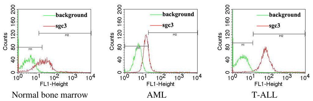 Binding assay of sgc3 in normal bone marrow, AML and T-ALL by flow cytometry.