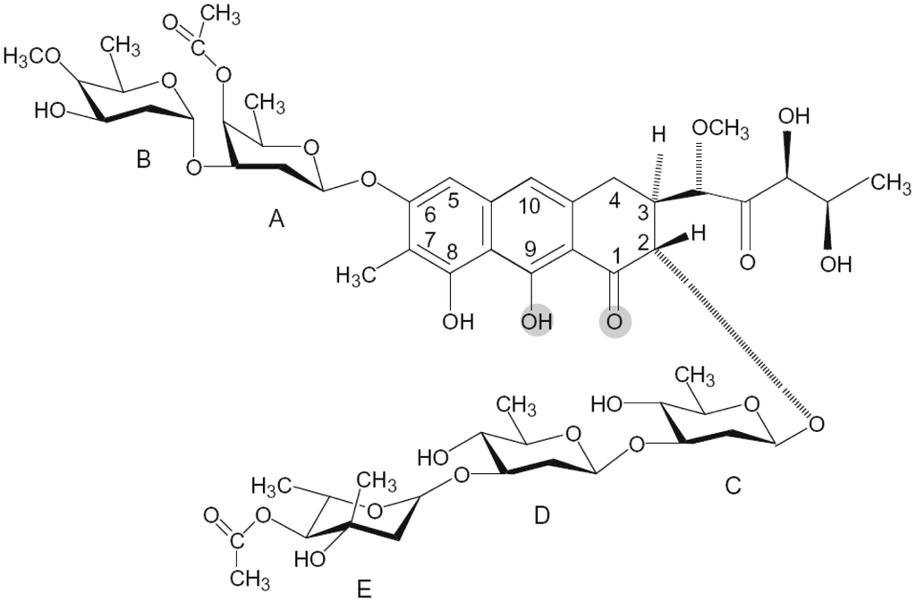 The chemical structure of chromomycin A3 (Chro). The oxygen atoms that coordinate the metal ion are shaded.