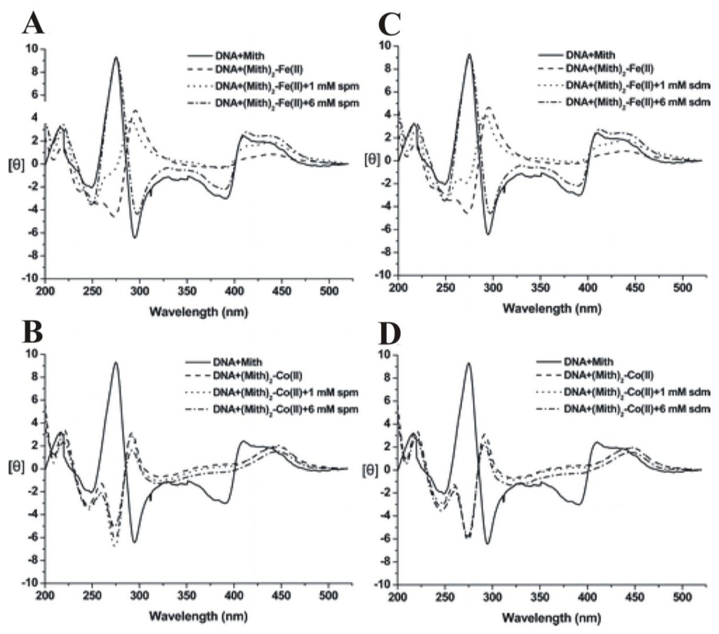 Comparison of the CD spectra of Mith-DNA, (Mith)2-metal ion(II)-DNA, and (Mith)2-metal ion(II)-DNA in the presence of (A,B) spermine (spm) and (C,D) spermidine (sdm) at 1 and 6 mM at 20 °C. Metal ions(II) include Fe2+ and Co2+. The drug concentration was 0.04 mM in a buffer of 20 mM Tris-HCl (pH 7.3). Reprinted with permission from ref. [90]. (Copyright 2009, American Chemical Society)