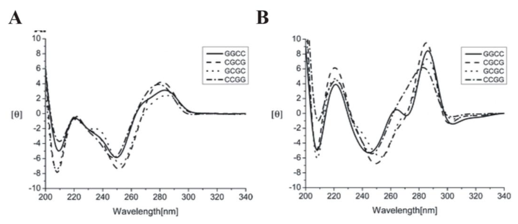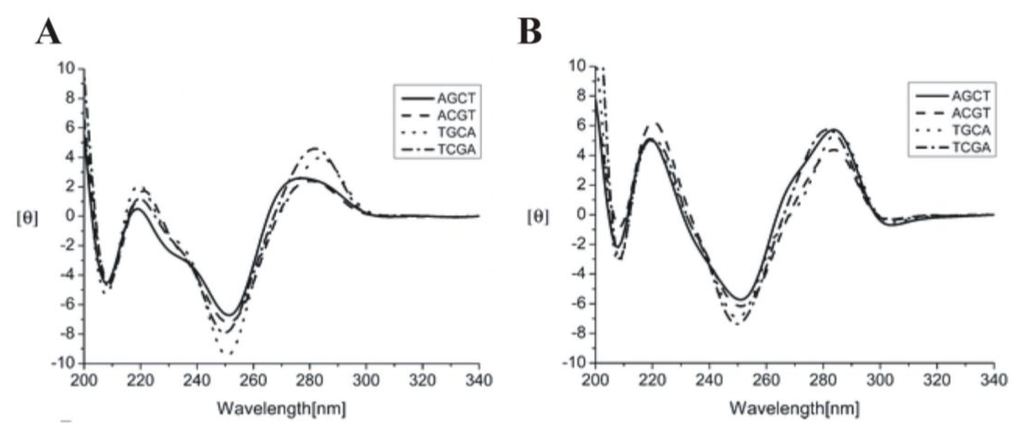 In the most common double helical structure, right-handed B-DNA, the helix makes a turn every 3.4 nm. There are about 10 base pairs per turn and +36° rotation per base pair [15]. The long wavelength CD spectrum of the sequentially heterogeneous DNA is conservative, but the CD spectra of synthetic oligo-nucleotides are depended on the primary sequence. B-form oligo-nucleotides are characterized by a positive long wavelength band at about 260–280 nm and a negative band around 245 nm. However, the position and amplitude of the CD bands show markedly differences in terms of sequence diversity [16–18].