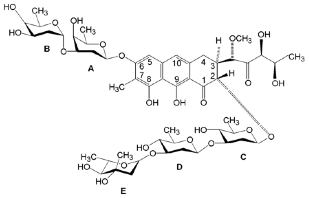 The anticancer antibiotic Mithramycin (Mith) is an RNA synthesis inhibitor and belongs to the aureolic family isolated from S. griseus [35]. Mith consists of aglycone ring, a chromomycinone moiety, and sugar residues connected to its either side by O-glycosidic bonds (Figure 4). Mith is a DNA-binding antitumor agent that inhibits tumor cell replication and transcription [36,37]. It is currently used in multiple areas of research, several cancer therapies and Paget’s disease [28,38,39]. Recently, Fibach et al. [40] revealed that Mith is a potent inducer of fetal hemoglobin production in normal and thalassemic human erythroid precursor cells, and suggested that Mith may be used as a therapeutic agent in certain neoplastic diseases.