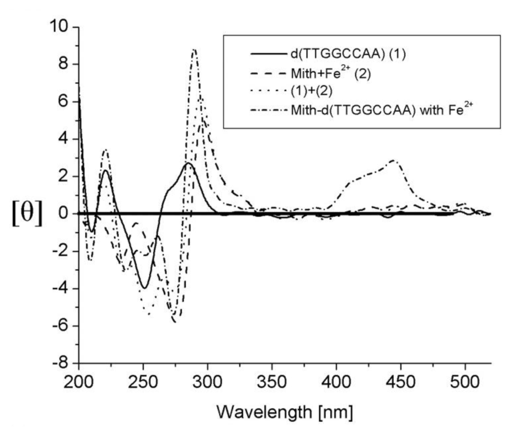 Mithramycin forms a stable dimeric complex by chelating with Fe(II). The structural effects of the [(Mith)2-Fe2+] complex on the conformation change of d(TTGGCCAA)2 DNA duplex has been characterized using CD analyses [41]. As shown in Figure 5, the CD spectra of the [(Mith)2-Fe2+] complex exhibit negative and positive peak intensities at 275 and 300 nm, whereas the CD spectra of d(TTGGCCAA)2 show a similar profile with B-DNA which have a band with negative and positive peaks around 250 and 280 nm. The CD spectra of Mith and DNA signals overlap in the 200–300 nm regions. In addition, the CD spectra of [(Mith)2-Fe2+]-d(TTGGCCAA)2 complex show a higher CD intensity at 287 and 275 nm when compared with the CD spectra sum of the [(Mith)2-Fe2+] complex plus d(TTGGCCAA)2, resulting from a strong exciton-type couplet. It could be used as evidence for the relative binding affinities of the [(Mith)2-Fe2+] complex toward this DNA oligomer duplex.
