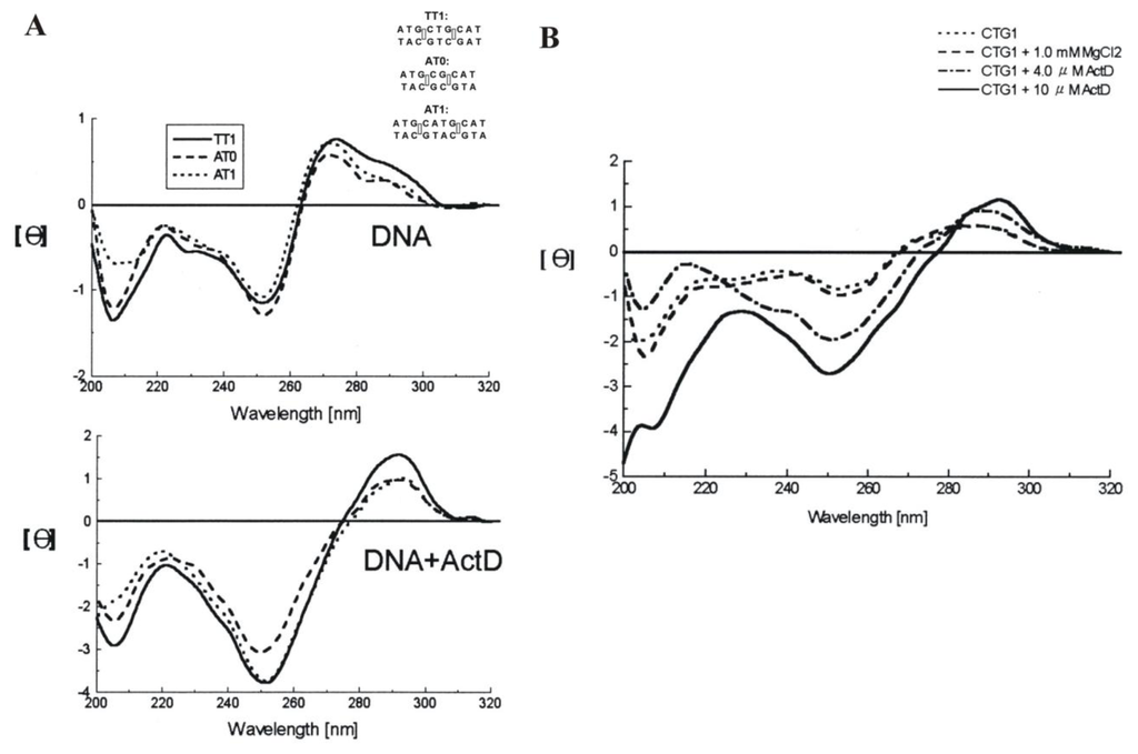 Figure 7A shows the CD spectra of DNA duplexes with AT0, AT1 and TT1 in the absence (top) and presence (bottom) of ActD, respectively [50]. The spectral changes observed for the ActD-DNA complexes showed a red shift from 275 to 290 nm, due to a A-type DNA transition upon ActD interaction [51]. In addition, the self-priming sequence CTG1 [5′-(CAG)4 (CTG)16-3′] can form intra-strand hairpins consisting of both normal and mismatched base pairs, which promote primer-template slippage during DNA replication. The CD spectra of CTG1 showed concomitant increased peak intensity in the presence of 10 μM ActD (Figure 7B). It suggests that conformational changes of long CTG repeats as well as increased stability are induced upon addition of ActD.