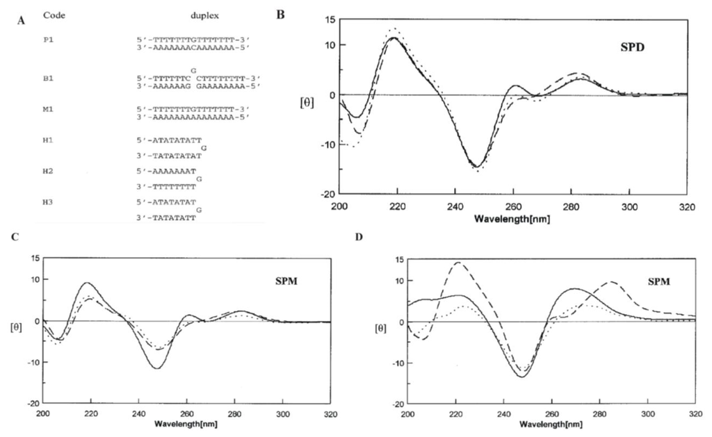 Figure 8B and C show the CD spectra of DNA duplexes with normal (P1) and abnormal (M1 and B1) sequences in the presence of spermidine and spermine, respectively. As previous described, DNA duplexes (P1, M1 and B1) have a split peak which includes a large positive peak at 280 nm and a weak positive peak at 260 nm in the region of 260–290 nm of the spectrum similar to the (A)n·(T)n sequence [66]. In Figure 8B,C, a band with negative and positive peaks around 245 and 280 nm have been observed for the P1, M1, and B1 CD spectra, which is typical of B-DNA [67] and suggests that DNA duplexes remain as B-DNA conformation. However, addition of spermine causes a decrease in the intensity of both M1 and B1, and to a lesser extent P1 in the region of 240–250 nm.